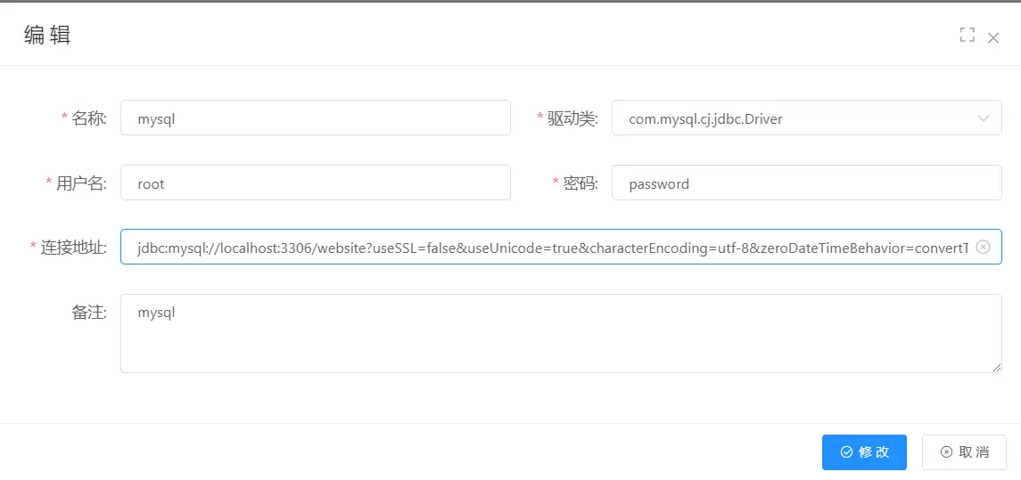 | 1 | jdbc:mysql://localhost:3306/website?useSSL=false&useUnicode=true&characterEncoding=utf-8&zeroDateTimeBehavior=convertToNull&transformedBitIsBoolean=true&serverTimezone=GMT%2B8 |